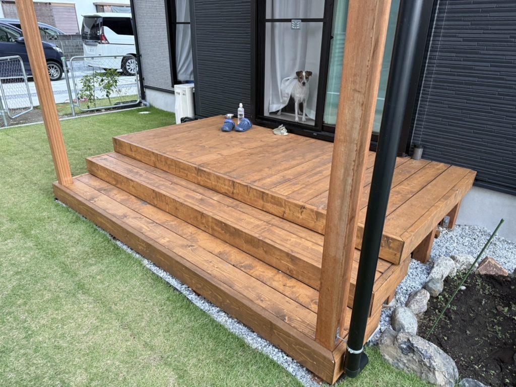 今回の事例は、お客様の「高耐久性」という要望に対し、プロの視点から最適な素材と設計を組み合わせることで、「コストバランス」「家族の安全」「愛犬の快適さ」というすべての付加価値をプラスした、理想的なウッドデッキ設計です。